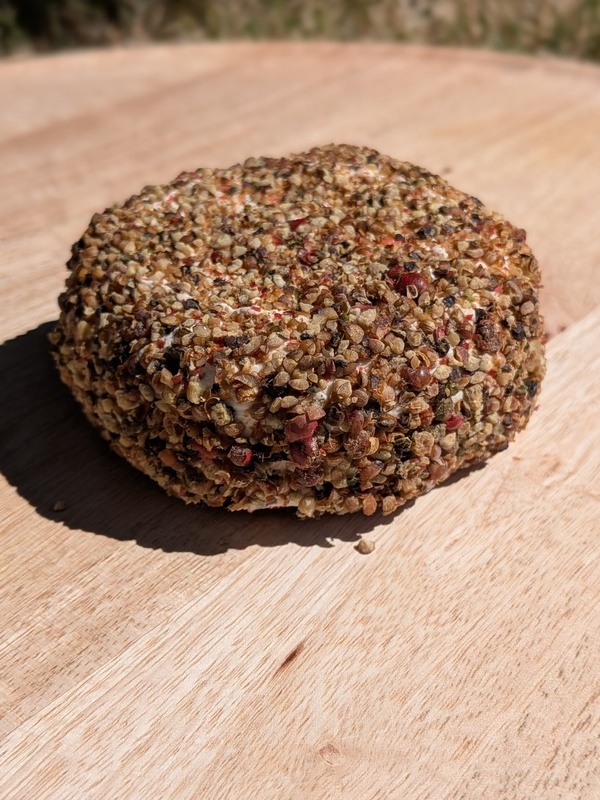 Lait entier pasteurisé, ferments lactiques, présure, poivre noir, vert et blanc, baie rose et coriandre.
